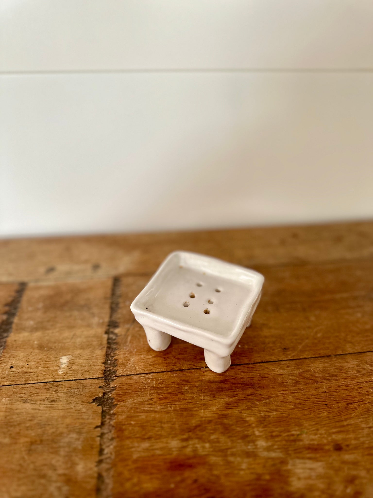 porte savon blanc brillant avec effet coulure sur 4 piedsL8cml8cmH4cm